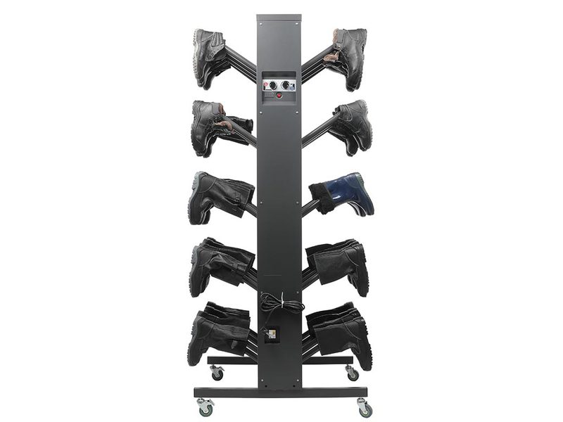 Принцип работы заключается в нагнетании теплого воздуха внутрь обуви через патрубки. Влажная обувь навешивается на расположенные на корпусе стойки кронштейны, через которые подается теплый воздух. Таким образом, конвекция воздуха происходит непосредственно во внутренней части ботинка, что существенно ускоряет процесс сушки. Каждый патрубок для обуви снабжен инерционным клапаном, перекрывает подачу воздуха, если ботинок не одет.