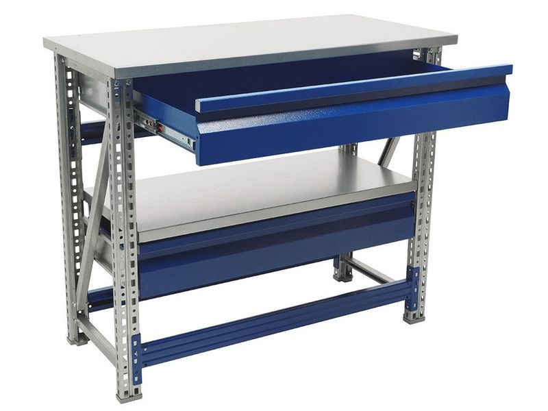- Возможность дополнить верстак полкой (нагрузка 100 кг) и выдвижным ящиком (нагрузка 30 кг).